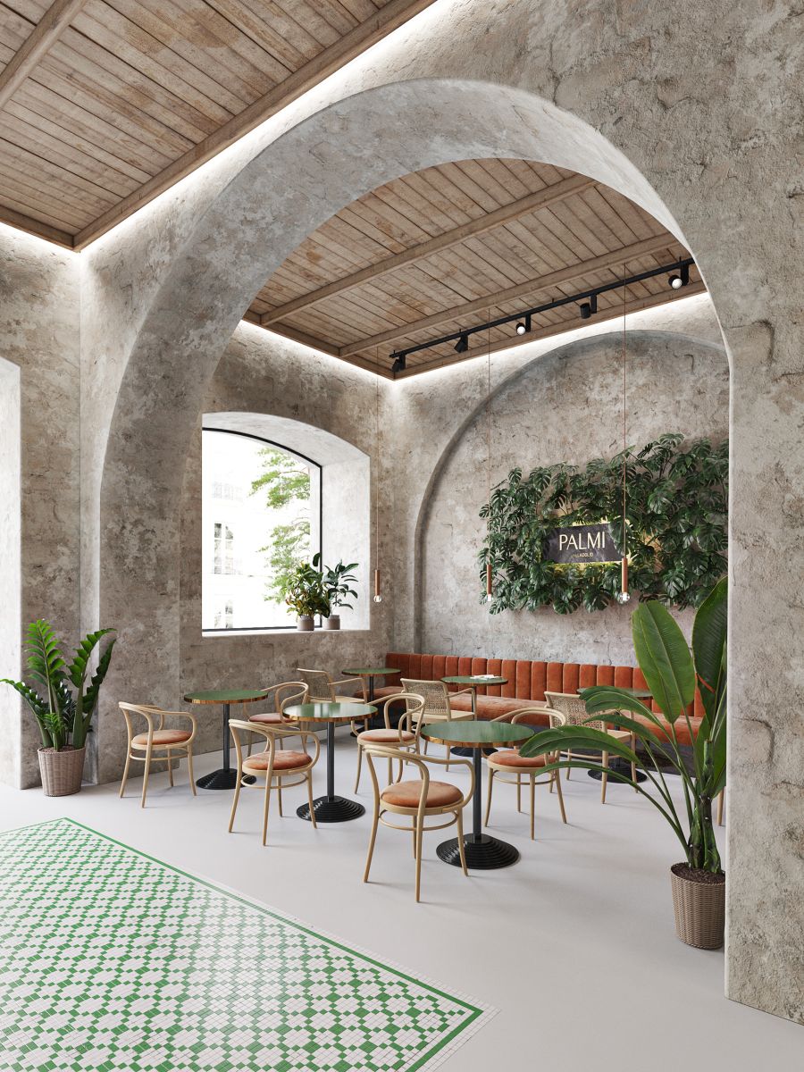 Este restaurante fue algo así como una excusa para experimentar con nuevas (para mí) maneras de trabajar mis texturas. Quería experimentar con maderas desaturadas y envejecidas, paredes revocadas con ese estilo rústico del muro visto y telas. También jugar con el contraste que supone un suelo impecable y sin mácula en contraposición con unos falsos techos y muros desgastados y con historia